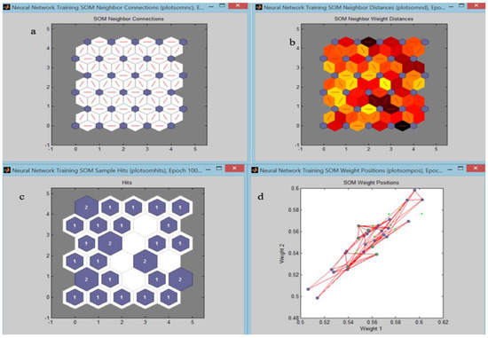 The relative number of vectors for each neuron is shown via the size of a color patch (Figure 7c). It plots an SOM layer, with each neuron showing the number of input vectors classified. Figure 7d plots the input data along the weights. The input vectors are represented as green dots, and show how the SOM classified the input space by showing blue-grey dots for each neuron’s weight vector, and connecting neighboring neurons with red lines.