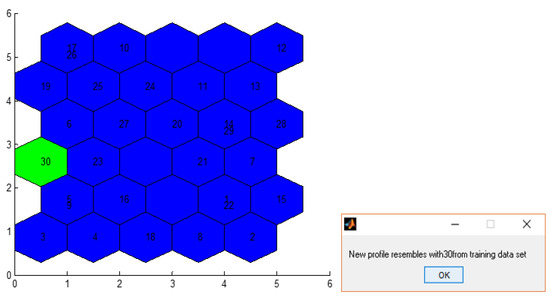 The proposed neuro-fuzzy tool provided the possibility to evaluate and visualize the progress of the SOM network’s performances for neighbor connections, neighbor distances, sample hits, and SOM weight positions. To evaluate these performances, in the testing phase, SOM1 and SOM2 received a new profile that was not considered in the parametrization or learning phases (Figure 7b).