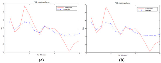 Secondly, we compared the performances in clustering of SOM1, SOM2, and FIS. The data flow, described in the scenario presented above, was the same. In addition, we could visualize the progress of the FIS with the FCM clustering process as an objective function. At each iteration, the FCM algorithm minimized this function to find the best location for the clusters, and its values were returned in graphical format. The progress of FIS errors, in the training and testing phase, are presented in Figure 9a,b.