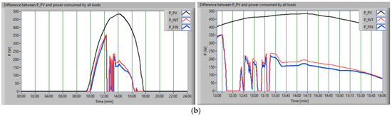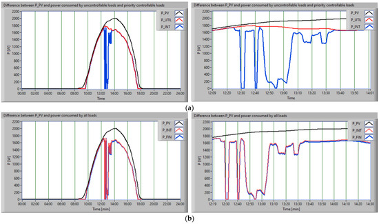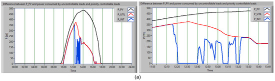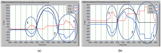 The scheduling approach firstly considered the constraint related to uncontrollable loads supply with energy from the RES. Thus, Figure 10 presents the PPV (black), the consumption of uncontrollable loads (red), and the difference between power and consumption (blue), for both scenarios.