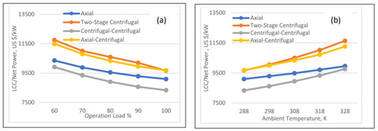 The economic evaluation of the GT with different compressor configurations considers the non-exergy related costs; these costs include all components of the evaluated systems. The associated costs cover capital investment, O&M, and fuel. In power plant applications, the selection of any GT configuration depends on its life cycle cost, which consists of the capital cost, fuel cost, fixed and variable O&M costs, and the salvage value (SV), as shown in Equation (3) [38]: