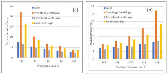 Economic evaluation strongly affects the selection of the GT engine type and compressor configuration. Accordingly, this study presents a detailed economical evaluation of a 20 year plan for the given GTs, considering the installation price and the annual payments for O&M and fuel, and money inflows from selling the electricity produced at tariff prices. The economic evaluation assumes an optimistic scenario for the given GT engines to determine which engine has the shorter payback period. It is necessary to be precise when estimating the initial and future values of associated cash flows for the various operational scenarios during the intended period of operation. The annual cash flows (ACF) are described as in Equation (5); this is the net cash inflow resulting from selling electricity at tariff cost (ET = 0.1 USD/kWhr) multiplied by the net produced power, balanced against fuel cost (FC) and operation and maintenance costs (O&M).