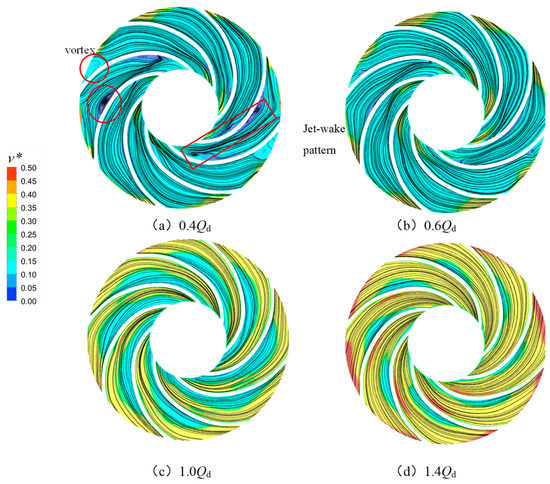 Under the condition of deviating from the design flow, some unstable flow phenomena in the impeller of a centrifugal pump, such as flow separation and jet wake, are clear. Figure 5 presents the relative velocity distribution on the mid-span of the first-stage impeller under different flow rates. For better analyzing the velocity field distribution characteristics of the first-stage impeller, the velocity coefficient v is introduced v*, which is shown as follows: