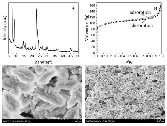 XRD pattern (A), N2 adsorption–desorption isotherm (B) and SEM images with different magnifications (C,D) of the prepared zeolite H-ZSM-5.