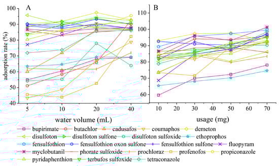 The adequate solvent volume provides H-ZSM-5 more opportunities to interact with absorbates. The large sample volume could widen the enrichment factor, while too large reduces the adsorption rate due to the target diffusing over a larger spatial area. The H-ZSM-5 is a nanomaterial with a greater density than water and tends to settle without external force conditions. The performance of 5 mL, 10 mL, 20 mL and 40 mL were studied under the equal adsorbent dosage. The adsorption rates of five pesticides, including bupirimate, butachlor, coumaphos, disulfoton sulfoxide and profenofos, were less than 60% at 5 mL of water, while the percentages were significantly improved when the volume increased to 40 mL (Figure 2A). More than ten analytes (e.g., demeton, disulfoton and phorate sulfoxide) maintained good adsorption and desorption at any sample volume, with recoveries ranging from 80% to 97%. Only the rate of disulfoton sulfoxide showed a decrease by 14% from a volume of 20 mL to 40 mL. The higher volume would decrease the efficiency of multiple simultaneous sample processing. Hence, 40 mL of sample was used in the preparation. In Cao’s study [], a sample volume of 5 mL was taken for the adsorption of neonicotinoid insecticides in environmental water using UiO-66. Although some SPE techniques have been reported to allow higher sample volumes [], they are usually limited by the inability to pass the SPE cartridge too quickly which reduces the concentration efficiency.