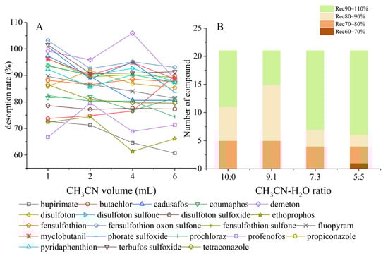 Acetonitrile has shown better efficiency of eluting the pesticides from the zeolite in previous studies [,]. Therefore, four volumes (1 mL, 2 mL, 4 mL, 6 mL) were discussed for all compounds studied using acetonitrile as the eluent. In Figure 3A, 21 pesticides were recovered between 61 and 106% at all studied volumes. Two (2) mL of acetonitrile (CH3CN) had better method stability as evidenced by distribution characteristics, with recoveries of 71–96%. Elution of 4–6 mL brought higher chance errors, resulting in lower recoveries of several targets. Hence, 2 mL was used to optimize further with four solvent ratios of CH3CN-H2O. The standards were prepared with the same ratio of solvent for quantification to avoid the difference in peaks patterns and sensitivity of the compounds diluted with different ratios of CH3CN-H2O. The results showed that a decrease in the acetonitrile ratio did not reduce the elution efficiency (Figure 3B). The recoveries of seventeen analytes ranged from 90 to 110% when eluting with a 1:1 mixture of CH3CN-H2O, except disulfoton obtained a recovery of 66%. The ratios of 7:3 and 1:1 both yielded recoveries in the range of 80–110% for nineteen pesticides. Eventually, the 2 mL of 1:1 CH3CN-H2O mixture was chosen as the desorbing solvent considering the environmental toxicity of the organic reagents. Our proposed D-μSPE procedure showed a significant improvement in the waste of organic solvents compared to similar previous reports. Solvent with 6 mL of ethyl acetate and 0.2 mL of methanol was used in Ma’s Magnetic SPE method []. The DSPE procedure based on modified zeolite NaY also used a minimum of 3 mL of organic solvent mixture [].