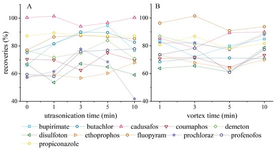 The operating times of ultrasound and vortex were investigated to improve the efficiency of the D-μSPE procedure. The results showed that 11 pesticides, such as phorate sulfoxide, demonstrated desirable recoveries with minor fluctuations between 80% and 110% for all parameters studied, without presented in Figure 4. In Figure 4A, the ultrasonic treatment contributed to improving desorption efficiency when the time was within 3 min, but recovery of prochloraz was extremely unsatisfactory over the 5 min of ultrasound. Optimization of vortex-assisted desorption was tested at the 3 min ultrasound. The results in Figure 4B showed a slight improvement in overall recoveries with the 10 min vortex, but similar outcomes could be expected with the 1 min vortex. Therefore, 1 min vortex and 3 min sonication were the optimized factors for desorption. It suggested that solvent transformation readily enabled the reversibility of the adsorption of zeolite H-ZSM-5.
