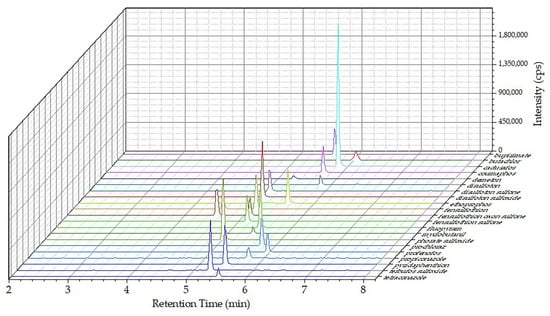 The chromatogram of 21 analytes at fortified level of 0.5 ng·mL−1 in black tea beverage.