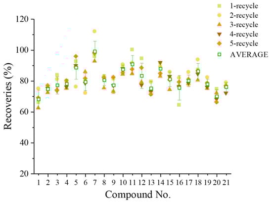 Zeolite H-ZSM was reused to pre-concentrate 21 pesticides in black tea beverages (Figure 6) at a concentration of 2.5 ng·mL−1 to assess reusability. Four replicates were carried out for each reuse. The results showed the mean recoveries for one to five times reuse in black tea at the range of 64.3–100.1%, 72.1–111.9%, 62.4–92.6%, 68.0–97.6%, and 66.1–97.6%, respectively. The RSDs of the five mean recoveries for each pesticide ranged from 2.1% to 12.7%. Twenty-one pesticides showed acceptable method accuracy and consistent deviations, demonstrating the feasibility of the regeneration procedure in general. Therefore, the regeneration of zeolite H-ZSM still has good methodological stability. In the previous study, H-beta zeolite was regenerated ten times to adsorb neonicotinoid pesticides from water, but was not applied to more complex honey samples []. The reusability performance after washing the UiO-66 crystals with 3 mL of acetone showed that the extraction rate remained almost stable after ten cycles, except for thiamethoxam, which was below 60% [].