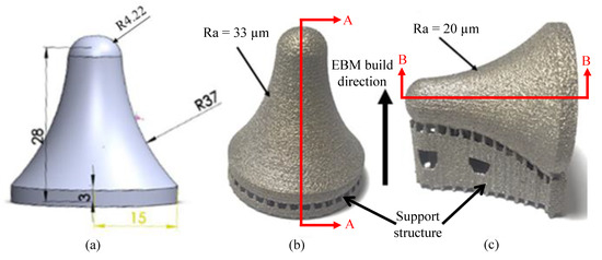 Non-prismatic samples were designed and produced in different build orientations by the EBM machine (ARCAM), as shown in Figure 1. The typical particle size of the Ti6Al4V powder was 71 µm. Powdered Ti6Al4V has the chemical composition shown in Table 1. The EBM parameters are shown in Table 2, all of which were chosen since they were the ones that ARCAM had recommended as the default for producing appropriate microstructures and mechanical properties for Ti6Al4V parts [33,34]. EBM Ti6Al4V components demonstrated a hardness of 329 Hv, yield strength of 930 MPa, and tensile strength of 970 MPa.