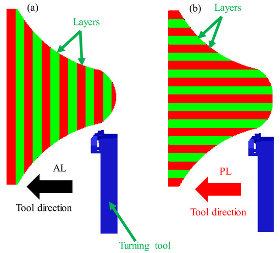 A simplified illustration of the various part orientations possible while turning an EBM: (a) across Layer (AL); (b) parallel Layer (PL).