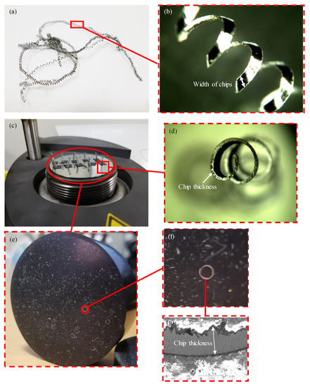 The chip analysis can indicate that better conditions of the machining process can be selected to enhance the surface roughness and tool wear [45,46]. After each experiment, the chips were collected. The steps for preparing the chip specimens are shown in Figure 4. Continuous chips are created during the turning of the Ti6Al4V EBM component, as shown in Figure 4a. An enlarged view of a chip is shown in Figure 4b. Ten chips were cut and mounted in a Bakelite matrix to enable the chip grinding process, see Figure 4c–f. However, at the beginning, before the mounting process, we made sure that the chips were in the correct orientation, as shown in Figure 4d, and later, to avoid any chip orientation error, the readings were taken on ten different chips. Furthermore, in Figure 4c the chips were from a single machining parameter, and three measurements were performed on each chip, i.e., totaling to 30 readings for measuring the chip thickness for a single set of machining parameters. Later, the average of 30 readings was taken, which minimizes the effect of the minor variable chip orientations. Silicon carbide papers of grit sizes 220, 400, 600, 800, 1000, 1500, and 2500 were used to grind the mounted chip samples. Figure 4g shows the maximum chip thickness measured by SEM. The chip morphology, flank wear, and surface morphologies of the turned part were measured by using a scanning electron microscope (SEM) (Model JCM 6000Plus) from Jeol, Japan.