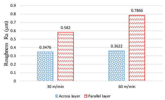 An EBM-produced part was turned in both AL and PL orientations. Figure 5 compares the Ra parameter with two alternative sets of turning parameters for each orientation. After turning, the Ra of EBM parts ranged from 0.34 to 0.78 µm. Ra was significantly smaller when the tool was moved perpendicular to the layer planes (AL) than when it was moved parallel to the layer planes (PL), as compared to [28,29]. As shown in Figure 5, there is a nearly 40% difference between the roughness values at V = 30 m/min for PL (Ra = 0.582 µm) and AL (Ra = 0.3476 µm) orientations. The difference between the roughness values for the two orientations further increased to nearly 54% when the cutting speed increased to 60 m/min. The lowest surface roughness was attained when the EBM-produced component was machined with the tool moving across to the layer planes (AL, as displayed in Figure 2). Figure 6 shows 2D roughness profiles extracted along AL and PL orientations. As a result, the 2D roughness curve for the AL orientation is smoother than that of the PL orientation. During machining in the AL orientation, the feed force was exerted on a single layer under the tool depth of cut. This led to compressive loading on the lower layers’ interfaces and prevented the layers’ ripping effect. According to Gupta et al. [47], this may be due to the improved interlayer metallurgical bonding, decreased porosity, and higher tensile strength along the AL orientation. In contrast, when the tool was moving in the PL direction, i.e., along the layers’ planes, shear forces were experienced by the layers’ interfaces, causing their possible ripping, as shown in Figure 7. This is why a higher roughness was encountered when PL orientation was considered during turning.