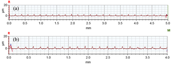 Two-dimensional roughness profiles at V = 30 m/min and f = 0.1 mm/rev for (a) AL orientations and (b) PL orientations.