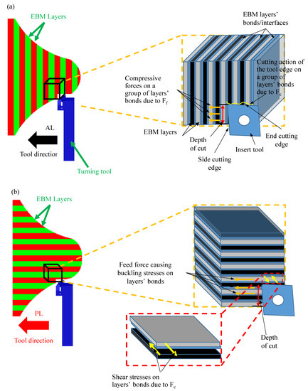 Schematic view of the effect of the cutting and feed forces during the turning process as (a) shear and compressive forces in across layers and as (b) tensile and buckling forces in the case of parallel layers.