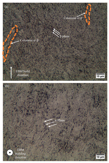 Microstructural images of the cross-sections shown in Figure 1 for the EBM Ti6Al4V part: (a) cross-section AA’; (b) cross-section BB’.