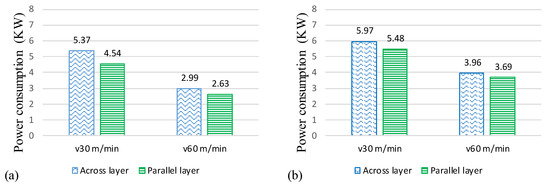 This is because, in the AL orientation, the feed force (Ff) causes compressive stresses on the layers’ interfaces while the cutting force (Fc) creates the cutting action of several layers interacting with the end cutting edge, as shown in the schematic Figure 7a. The cutting action of the Fc force and compressive action of the feed force led to a good surface finish in the case of the AL orientation. At the same time, it led to more resistance from the material during cutting, attributable to the higher power consumption. In contrast, in the PL orientation, the feed force caused buckling stresses on the layer interfaces, while the cutting/tangential force caused shear stresses on the layer interfaces, as shown in the schematic Figure 7b. The buckling and shear stresses at the layer interfaces in the PL orientation weakened the material for cutting and resulted in reduced overall power consumption. Furthermore, the buckling stresses also reduced the chip thickness (see Figure 10 and Figure 11), lowering the power consumption, as the power consumption during machining is directly affected by the chip thickness [8].
