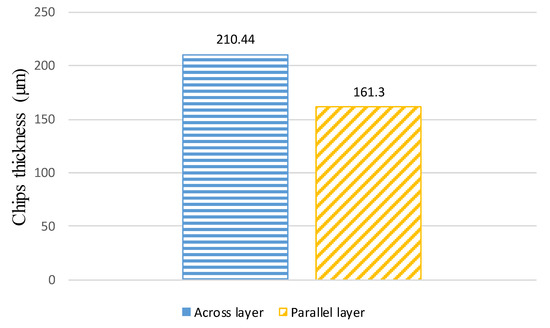 Chips’ thickness measured for AL and PL orientations at f = 0.1 mm/rev, V = 60 m/min, and d = 0.2 mm.