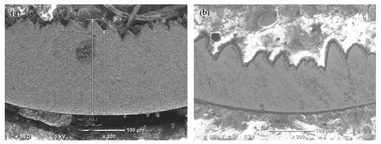 Figure 10 shows the significant difference of 23% in the average of ten chip thickness readings taken for the two-part orientations. As shown in Figure 11, the two-part orientations have a noticeable difference in the degree of the serrations on the chips, which is consistent with those found by [29]. This occurs because the EBM layers inside the chip give varying chip bending and curling resistances. Figure 11a shows substantially larger saw-tooth chips for AL orientation due to the increased thickness resulting in greater power consumption. Although the AL orientation generates more saw tooth chips, it produces an enhanced surface. Due to the shearing and tensile stresses on the layer interfaces, the degree of the serrations on the chips is lower in the case of PL orientations, as shown in Figure 11b. It is easy to spot that the chips produced as a result of turning in the AL orientation possess distinctive saw-toothed morphology (more serrated). In contrast, more rounded-toothed chips were produced in the case of PL orientation. The reason for this is that the machining is implemented in such a way that the collective impact of the cutting force, feed force, and part orientation on the interfaces of the layers resulted in variable chip formation. It is worth mentioning that, in most circumstances, the Ti6Al4V alloy shows serrated chips [49,50], as produced in the case of AL orientation. Therefore, it looks like an unnatural machining response is presented by Ti6Al4V while machined along the PL orientation.