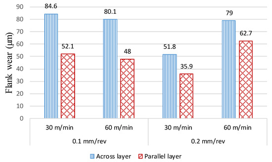 Flank wear for the two orientations: (a) AL orientation and (b) PL orientation at f = 0.1 mm/rev, V = 60 m/min, and d = 0.2 mm.