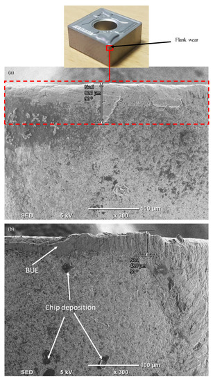 The flank wear for both orientations at a variety of turning parameters (cutting speed (V) and feed rate (f)) is displayed in Figure 12. There is a considerable difference between the two orientations, with the AL orientation having a higher value than the PL orientation for all turning parameters. In Figure 12, at a speed of 60 m/min and feed rate of 0.1 mm/rev, the maximum difference between the flank wear in AL orientation and the flank wear in PL orientation is approximately 40%. Figure 13 shows the morphology (wear) on the flank faces for both orientations, as assessed via SEM images, and shows the flank wear for both inserts. In Figure 13a, a maximum flank wear of 80.1 μm was detected in the case of AL orientation. At the same time, a maximum flank wear of 48 μm was detected in the PL orientation, as shown in Figure 13b. This was ascribed to the higher cutting force experienced during turning in the AL orientation as compared to [29,31], which can be explained by the schematic view in Figure 7a and the thicker chip load, as shown in Figure 13a.