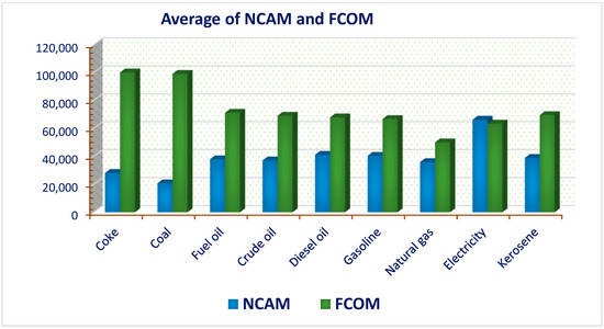 where ‘’ and ‘’ demonstrate China’s provincial divisions and energy products, respectively. denotes the constant measure of weighted CO2e fraction in the carbon element of CO2e, represents the energy products’ consumption, denotes the average net calorific measurement, and indicates the factor of combined CO2e from nine energy products. The data are compiled from province-specific China Energy Statistical Yearbooks from 2002 through 2020. Moreover, the parametric values for and are extracted from IPCC [37]. Figure 1 shows the average of and for the consumption of each energy product. Detailed explanations of the formation and calculations of and can be obtained from the previous studies [35,36,37,38].
