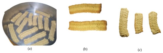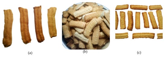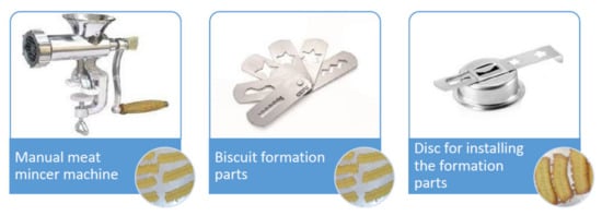 The biscuit dough was shaped by a manual meat mincer machine (Figure 2), with some modified parts, to produce bars and to cut biscuits with a range of 7 cm in length and of 3 mm in height. The baking process was performed in a locally made convection oven at 180 °C for 10 min.