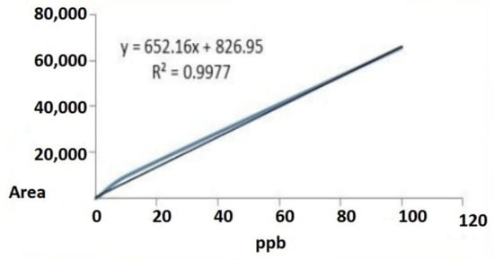 The acrylamide standard was determined, with a peak observed at 3.5. A good coefficient of correlation of 0.9977 was estimated (Figure 3). The limit of detection (LOD) for acrylamide content (signal to noise 3) was 10.5 μg/kg, while the limit of quantification (LOQ) (signal to noise 10) was 33.3 μg/kg. Laboratory experiments showed that its recovery was at the level of 85% ± 5%.