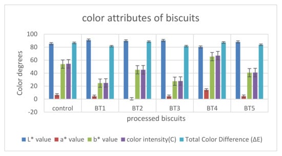 According to Rao et al. [], a Hunter Lab color analyzer was used to test the color properties of biscuit samples (Hunter Lab color Flex EZ, USA). The L* value (lightness index scale) ranges from 0 (black) to 100 (white), whereas the a* value indicates redness (+a) or greenness (a) and the b* value indicates yellowness (+b) or blueness (b). After filling a Petri dish to the brim with the samples, the Petri dish was placed directly on the colorimeter sensor. The C value indicates color intensity, and the hue angle (hab) value refers to the degree of redness (when hab = 0°) and yellowness (when hab = 90°).