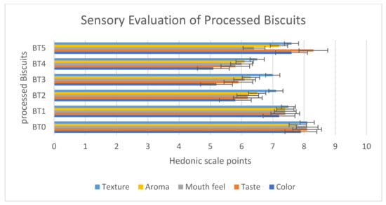 The sensory evaluation of biscuits changed slightly according to the panelists ‘results, as shown in Figure 6. The sensory evaluation of color was the most reduced value in the sample (BT4 = 5.1). The taste and mouth feel values were the lowest in the same sample, 5.8 and 6.0, respectively. However, the aroma and texture were 6.1 and 6.5, respectively. These findings could be attributed to a lack of a color grade, as well as any enzymatic activity in the treated sample media, especially in the baker’s yeast treatment. The Maillard reaction is responsible for the creation of these products’ specific sensory attributes, and acrylamide is also formed during the reaction []. The color of baked products is one of the most important factors influencing consumer acceptance and food quality []. The majority of the methods used to reduce this toxic compound have a negative impact on the final product’s taste and appearance []. The use of fungal L-asparaginase is a relatively new, promising, and effective method for lowering acrylamide levels in food. This enzyme contributes to mitigation strategies in two ways: it interferes with the Maillard reaction, and it removes precursors by converting L-asparagine into L-aspartic acid (nontoxic) without changing the nutritional value, appearance, or flavor of the final product [,].