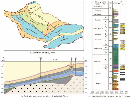 The Maigaiti Slope is located in the front of the Southwest Depression of the Tarim Basin, adjacent to the Xikeer structural belt in the north, connected to the Bachu Uplift by the Selibuya mazatake fault in the northeast, and bounded by the Kashi Depression in the west and Yecheng Depression in the southwest. It is a slope structure with rapid northeast tilting in the late Neogene. Its exploration area is about 40,000 square kilometers (Figure 1). The Maigaiti Slope strikes from northwest to southeast. Influenced by multi-stage tectonic activities, the Maigaiti Slope has east–west segmentation in plane. From west to east, several fault structural belts formed, such as the Kuoshilake structural belt, Qunkuqiake structural belt, Selibuya structural belt, Luositage structural belt, Luonan-Niaoshan structural belt, and the Mazhatage structural belt.