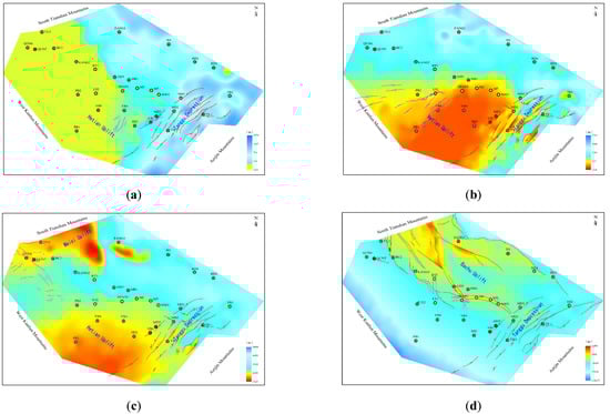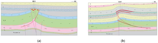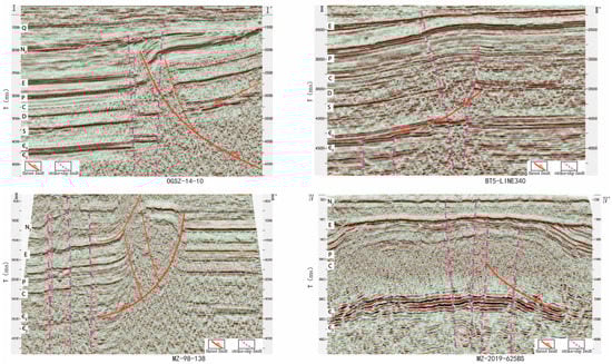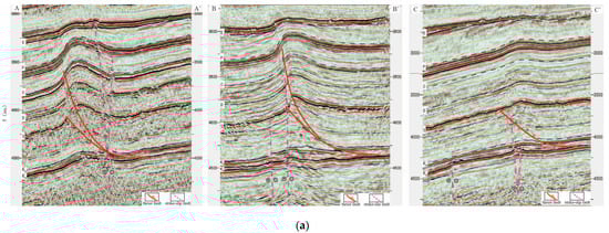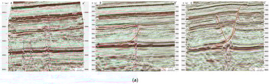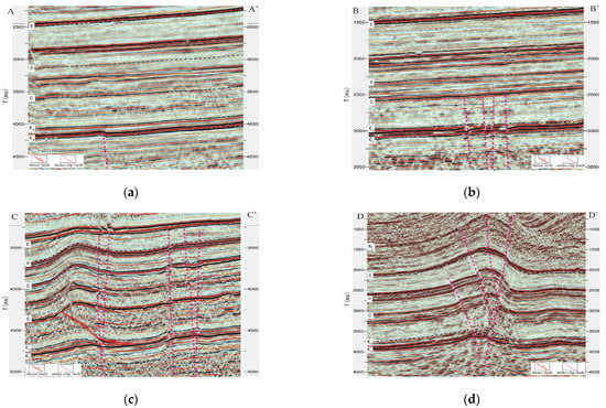 The stage characteristics of strike-slip faults of the Maigaiti Slope were studied by detailed seismic interpretation of the whole layer, and the tectonic evolution of the basin [22,23,24]. The Maigaiti Slope strike-slip faults can be roughly divided into four stages: early Caledonian, late Caledonian, Hercynian, and Himalayan. Early Caledonian strike-slip fault: the longitudinal fault disappeared in the Middle Cambrian. It can be seen from the three-dimensional earthquake that this fault has a certain control on the deposition of the Middle Cambrian, and the Middle Cambrian shows certain synsedimentary characteristics (Figure 2a); Late Caledonian strike-slip fault: the fault extends vertically to the top of Ordovician limestone, seismic facies phenomena such as “beading” and “flake reflection” of Ordovician carbonate rocks related to the strike-slip fault can be seen in the seismic section, which is direct evidence of the development of the strike-slip fault in this period (Figure 2b); Hercynian strike-slip fault: the longitudinal upper fault to Carboniferous to Lower Permian disappeared, the seismic profile shows the characteristics of “flower structure”, Hercynian is Maigaiti Slope strike-slip fault mainly formed stage (Figure 2c); Strike-slip faults in Himalayan period: this fault traverses the Paleogene system vertically, mostly to the Neogene, and partially to the Quaternary system (Figure 2d).