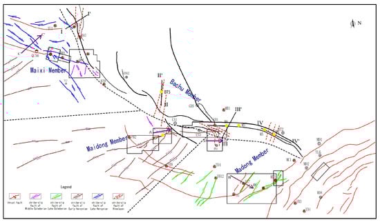 The development characteristics of thrust and strike-slip faults in the longitudinal section were described through full-layer seismic interpretation, the distribution characteristics of plane faults were described by 3D seismic coherence attribute analysis, and the fault characteristics of the Maigaiti Slope were understood in 2–3D seismic combination, and 3D vertical and horizontal. According to the research findings, two groups of strike-slip fault systems are developed in the main part of the Maigaiti Slope, which are NE and NW-trending. However, there are certain differences in fracture-formation period, fault strike, and tectonic style in different regions. Therefore, the study area can be divided into four zones: Maixi Member, Maidong Member, Madong Member, and Bachu Member (Figure 3).