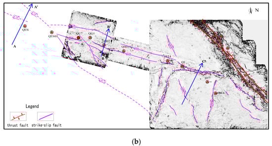 (4) The Bachu Segment: Himalayan strike-slip faults are mainly developed, distributed on the southern slope of circum-Bachu Uplift. The Selibuya fault-Tuohetage-Kangtakumu fault zone, Haimiluositage-Gudongshan fault zone, and Mazhatage fault zone are successively developed in the southern slope of Bachu Uplift from north to south [25,26]. The strike-slip faults are mainly developed between the fault zones, which are the adjustment faults between the fault zones. With the characteristics of dextral strike-slip faults, four concentrated development zones of strike-slip faults can be roughly identified (Figure 3 and Figure 6).