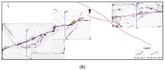 (2) The Maidong Segment: It can be clearly identified by the 3D seismic coherence attribute that this segment mainly develops NE-trending and a NE-trending early Hercynian dextral strike-slip fault system. The fault zone extends about 250 km in plane length and converges from west to east, showing the characteristics of “wide in the west and narrow in the east, strong in the west and weak in the east”. From the seismic profile, it can be seen that the strike-slip fault in the west reaches to the Permian igneous rock segment, the fault zone is 4–7 km wide, and the branch faults are developed. In the periphery of the LS2 Well area in the middle part, the strike-slip fault breaks to the top of the carboniferous system, and the fault zone is narrow—about 2–4 km—showing continuous linear distribution in plane. In the periphery of the eastern LS3 Well area, strike-slip faults extend to the Cambrian system; most of them disappear into the Middle Cambrian gypsum rock layer, showing discontinuous linear distribution characteristics in plane (Figure 5).
