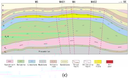 (3) The coupling relationship between the active period of strike-slip faults and the trap-forming period is the key to hydrocarbon accumulation in the Carboniferous–Ordovician, which determines the petroleum properties and enrichment horizon of the Cambrian post-salt system. These are: medium-heavy oil in the Caledonian period, light oil in the Indosinian period, and dry gas in the Himalayan period.