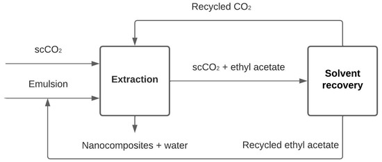 Supercritical CO2 (scCO2) is utilized in the supercritical fluid extraction of emulsions (SFEE) to swiftly extract the organic phase (O) from an O/W emulsion. The dissolved substances in the organic phase precipitate into small particles and remain suspended in the water (W) with the aid of a surfactant. The process can be continuously conducted using a packed column in a counter-current flow of the emulsion and scCO2, at moderate pressure (8–10 MPa) and temperature (37–40 °C). To ensure the commercial viability of this technique, the organic solvent must be separated from the CO2 to facilitate the recirculation of both streams within the process while minimizing environmental impact. Thus, the aim of this work was to design a plant to produce submicron materials using SFEE, integrating the recovery of both solvents. First, experimental equilibrium data of the ternary system involved (CO2/ethyl acetate/water) were fitted with a proper thermodynamic model. Then, simulations of the whole integrated process at different scales were carried out using Aspen Plus®, along with economical evaluations. This work proposes the organic solvent separation with a distillation column. Thus, the two solvents can be recovered and recycled to the process in almost their entirety. Furthermore, the particles in the aqueous raffinate are produced free of solvents and sterilized for further safe use. The costs showed an important economy scale-up. This work could ease the transfer of the SFEE technology to the industry.