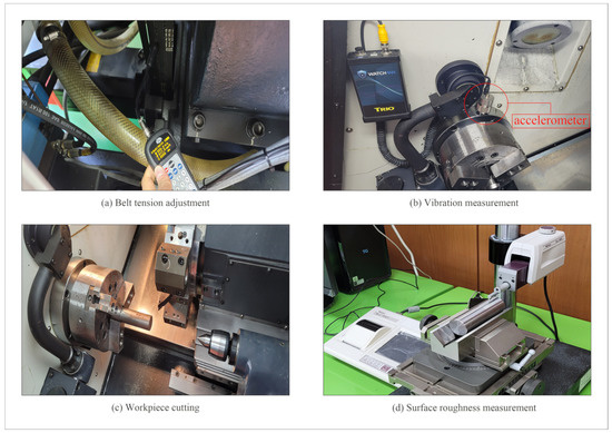 Schematic of the experimental procedure. (a) Tension adjustment of the belt that transmits power to the servomotor and spindle of the CNC lathe; (b) vibration measurement of the spindle inside the cutting room; (c) workpiece cutting according to conditions; (d) measurement of surface roughness after cutting.