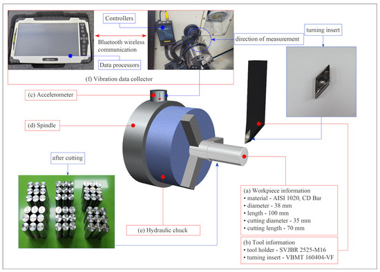 Schematic of tools and workpieces used in cutting. (a) Information on workpieces used for cutting; (b) information on tools used for cutting; (c) accelerometer used for vibration measurement and direction of measurement; (d) spindle at vibration measuring position; (e) hydraulic chuck to hold the workpiece; and (f) Vibration data collector used for vibration measurement.