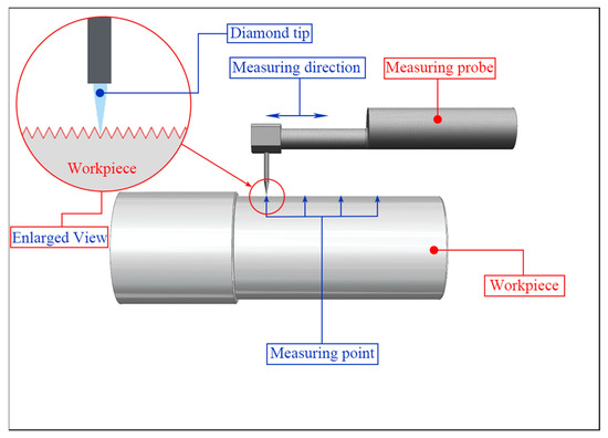 In this study, four surface roughness measurements were performed for one workpiece as shown in Figure 4, at 15 mm intervals. The specifications of the surface roughness equipment used in the experiment are shown in Table 9. Figure 1d shows the measurement equipment.
