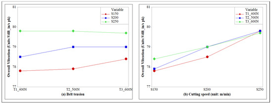 Analysis result of overall vibration. (a) Overall vibration according to belt tension; (b) overall vibration according to cutting speed.