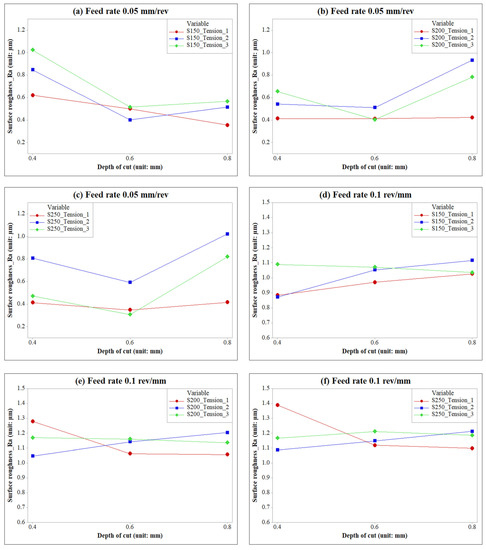 The experimental results are classified according to the feed rate of 0.05 mm/rev as shown in Figure 7a–c, and the criteria are a feed rate of 0.1 mm/rev for Figure 7d,f.