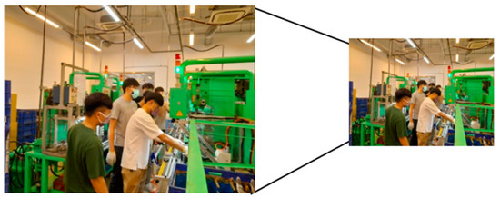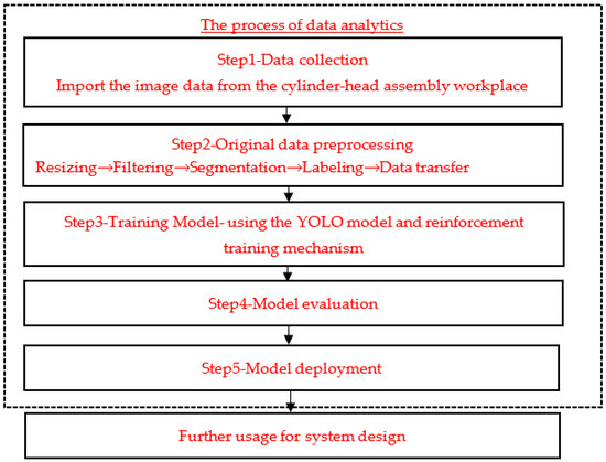 This study used the image data from the cylinder-head assembly workplace as a training example. Figure 8 shows the photographic tool, and Figure 9 shows the flow of the experiment. The image dataset has to be resized, filtered, labeled, and segmented sequentially; the preprocessed data were imported into the YOLO-based model. Finally, the results and data are incorporated into the proposed system for further use, such as alarm notification, automatic report generation, and SCADA-related applications.