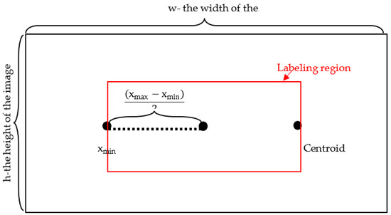 Figure 3 shows the image and label regions. Where xmin, ymin, xmax, and ymax are the coordinates of the centroid in the labeling region, w is the image’s width, and h is the image’s height. The width Ratio is the ratio of the labeling region’s width to the image’s width. However, the Height Ratio is the ratio of the labeling region’s height to the image’s height.