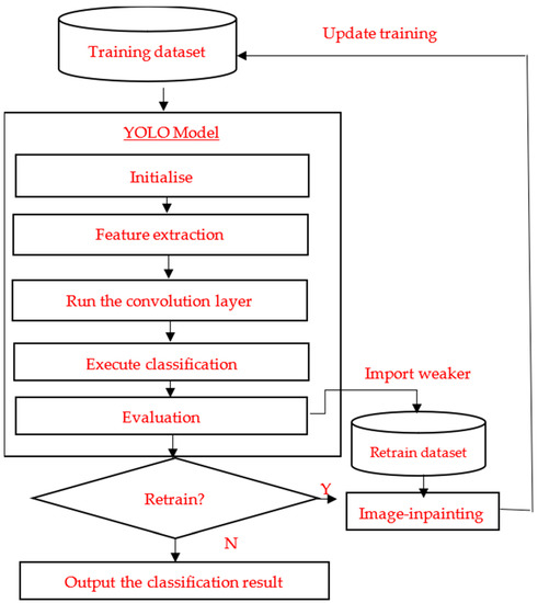 The enforced learning can adjust the trained result to execute the additional processing. This study uses a reinforcement-learning mechanism to reprocess and retrain the image with an incorrect label. The image data with inaccurate prediction results during the model training is defined as a weaker pattern, which may have microscopic defects that may reduce the prediction accuracy. The weaker patterns could be corrected using image-inpainting technology, a conservation process for reconstructing an image’s damaged, missing, and deteriorating regions. The image after inpainting was retrained in the model for reinforcement training. It enhances the prediction performance by expanding the solution space for assessing the revised weaker pattern. Figure 4 shows the reinforcement training mechanism.