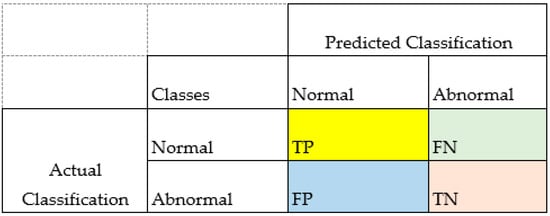 We used accuracy, recall rate, precision rate, F1-score, and Matthews correlation coefficient (MCC) to assess the classification performance. Each criterion is highlighted below (Figure 5). The confuse matrix this study employed has four types: True Negative (TN), True Positive (TP), False-Negative (FN), and False-Positive (FP). TP indicates that the model-given prediction is “Normal”, and the real or actual value was “Normal”. TN indicates that the model-given prediction was “Abnormal”, and the real or actual value was “Abnormal”. FP indicates that the model-given prediction is “Normal”, and the real or actual value is “Abnormal”. FN indicates that the model-given prediction is “Abnormal”, and the real or actual value is “Normal”.