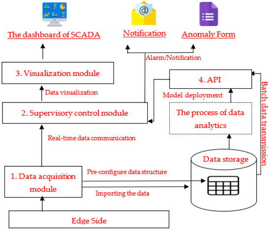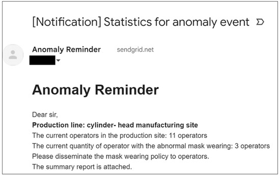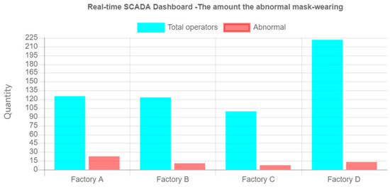 This study presented a CAADS involving four modules from the edge (manufacturing site) to the cloud sides to attain the aim of real-time SCADA for anomaly detection (Figure 6). The bottom module is the data acquisition module. The image data can connect to the cloud and be retrieved into a customized database in the data acquisition module. The supervisory control module executes a real-time alarm and notification using the customized protocol. It provides the export of a form, such as a list of employee workplace violations for epidemic prevention. The trained model described in the previous section was applied in the data analysis module to evaluate the laborers’ mask-wearing behavior while receiving the image data. Furthermore, the top module is the data visualization module, where the statistical outcomes are illustrated on the visualization dashboard for the user to monitor and determine the current status.