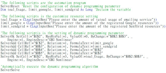 This study uses the Representational State Transfer Application Programming Interface (Restful API) to construct an analytics module. The Restful API is the API that is based on the Restful architecture. The Restful, which indicates representational state transfer, presents the architecture of communications, usually applied in the access of third-party services. The API is the middleware between the user and the service. Subsequently, the Restful API can access the web service by sending HTTP requests. This study develops the API Server and creates the query argument and response content. The trained model after DA is deployed as an API, while the real-time data or batch data is imported into the trained model using the API. After the user pre-configures the cloud data project using the data acquisition module, the data is automatically retrieved into the cloud data storage using the supervisory control model. While receiving client-side queries, the trained model is presented as a core service for API calls. The MQTT message sent by the supervisory control mode can be parsed as real-time data, which can import the trained model by calling the API. Here, the received argument while calling the API and the response result of the API must separately encode and decode using Message-Digest algorithm 5 (MD5). Therefore, the API connectivity and communicating content can be protected based on MD5 encryption and decryption. This analysis used a third-party service to send the anomaly notification to the user. The third-party services offered the users a limited amount of services for each registered resource account. This study elucidated the objective function and non-linear constraint (Equation (12)). The GRG non-linear solving method is used to calculate the number of optimal resources. The automatic program was employed to dynamically run the GRG non-linear solving method to assign the resources and use the third-party service via an API (Figure 7).