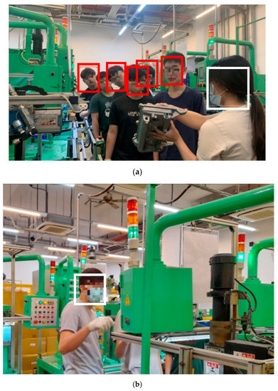 The output of image labeling (The red box line is labeled as an abnormal class/white box line is labeled as a normal class). (a) The pictorial diagram- multiple operators (The operators’ faces were pixelated). (b) The pictorial diagram- single operator (The operator’s face was pixelated).