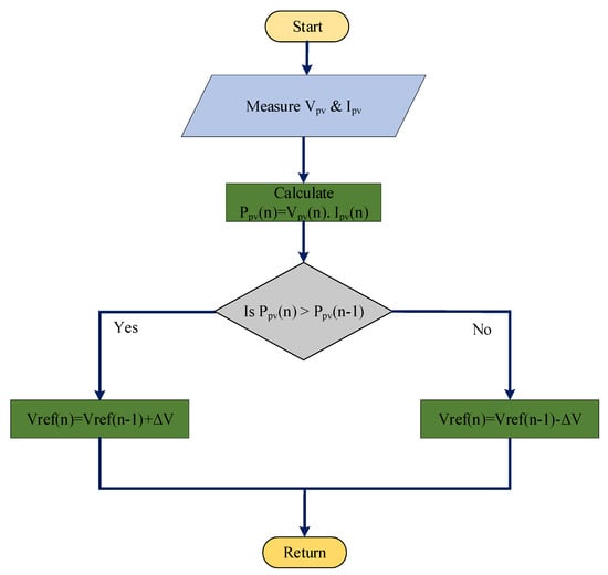 Maximum power point tracking is an algorithm included in change controllers and is utilized to harvest the maximum amount of available power from PV modules under specific circumstances. Different algorithms are used to control the duty cycle converter [,,,,,]. Maximum power point refers to the voltage at which a PV module is capable of producing the most amount of power. The maximum power can change depending on the amount of solar radiation, the surrounding temperature, and the temperature of the solar cell.